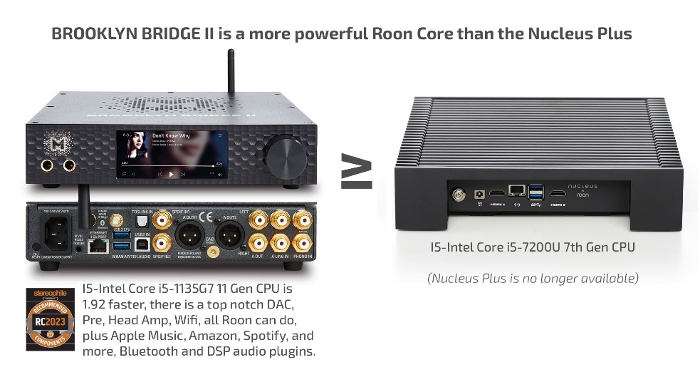 BUILT IN ROON CORE i5 (11th Gen) Intel CPU - (more powerful than the Nucleus+) POWERED BY ROON OS: Brooklyn Bridge has all functionality of a Roon Core CPU combined with high performance DAC. Roon Software can be operated from Roon Remote App or from Mytek Web Interface from any device connected to the network. Bridge can function as a multiroom playback machine playing to different Roon end points.