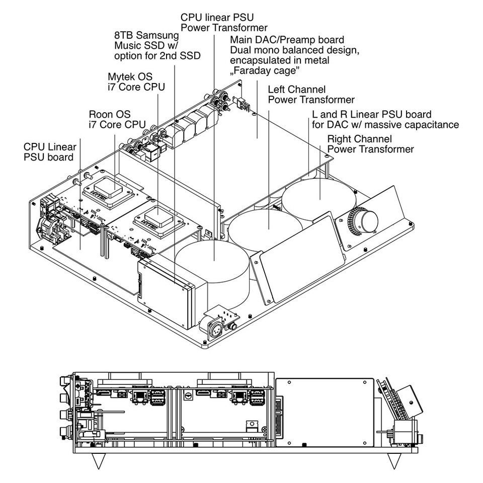Cost no object dual mono all balanced audio path in analog and DAC circuits. 3 oversized linear power supplies for digital, for the left and right DAC/analog circuitry, each using shielded low noise toroidal transformer with automatic adjustment to 100-240VAC.