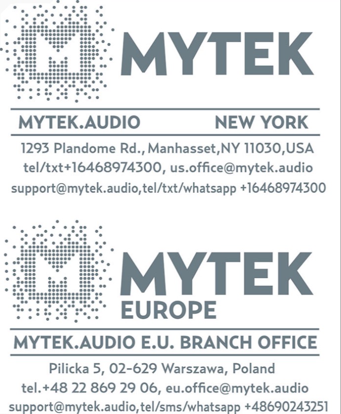 Each individual Mytek product undergoes comprehensive quality control and a complete test before shipping. This Mytek product is warranted by Mytek to the original purchaser against defects in workmanship and materials used in manufacture for a period of two years from the date of purchase for all products and 5 years for the flagship Empire series products. Faults due to customer misuse, unauthorized modifications or accidents are not covered by this warranty. Removal of serial number sticker voids warranty. No other warranty is expressed or implied. If you suspect that your product is faulty, please contact the place of purchase or alternatively: in the U.S.: Mytek US Office in New York, in the E.U.: Mytek EU Office in Warsaw, Poland. Prior to shipping for warranty services, the customer or dealer MUST OBTAIN an RMA number from Mytek. Units sent without RMA number will not be accepted. Mytek extends reasonably priced repair service for all units manufactured to date that are less than 10 years old. Older equipment may or may not be repaired depending on the availability of parts.